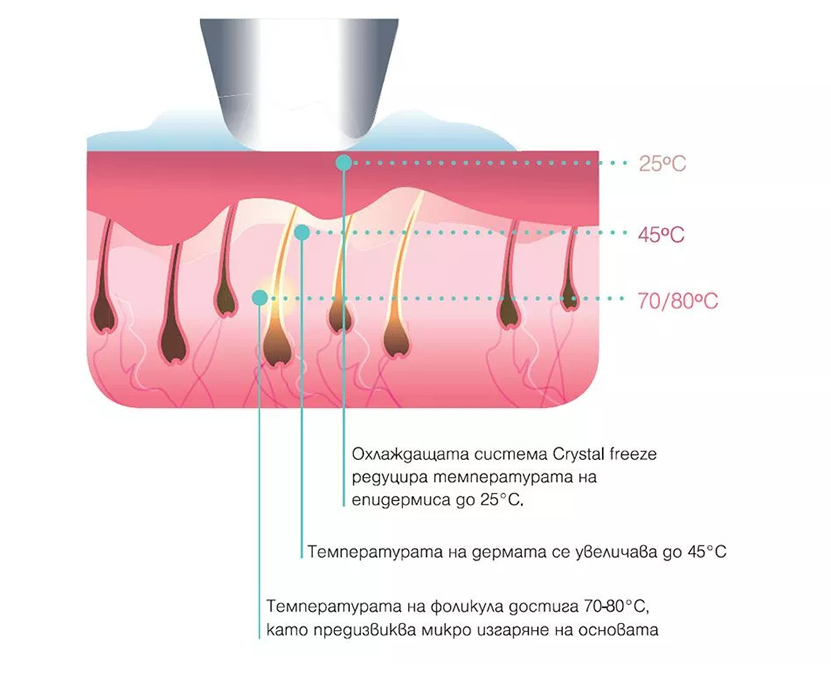 За разлика от останалите охладителни системи, Crystal Freeze има паралелен ефект, тъй като предотвратява епидермалната топлина в същото време, когато се подават импулсите, което означава, че зоната може да бъде предварително охладена и охладена след всеки импулс.
